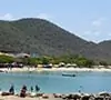 Un bonito boulevard de casas multicolores es el marco perfecto para esta playa de tranquilas aguas turquesa .