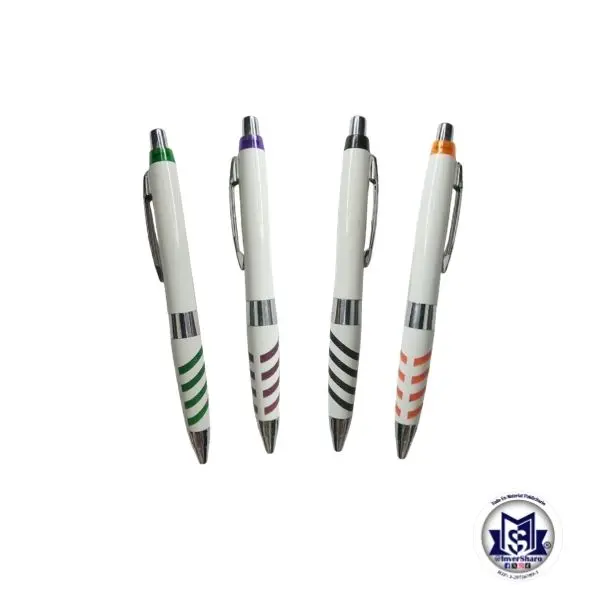 Boligrafo plástico cuerpo blanco con diseño de rayas, tinta negra con mecanismo rectractil con detalle en cuerpo: verde, morado,rojo, rosado, azul, naranja