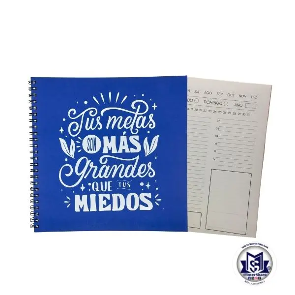 Agenda Semanario Anillada, tripa semanal permanente de 160 hojas, cubierta de sufalto, medida 21 cm ancho x 21 cm largo. Contiene hoja de datos personales, calendario y hoja de notas.