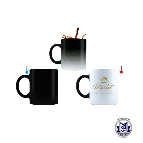 Taza de cerámica negra con efecto mágico al colocarle agua caliente.